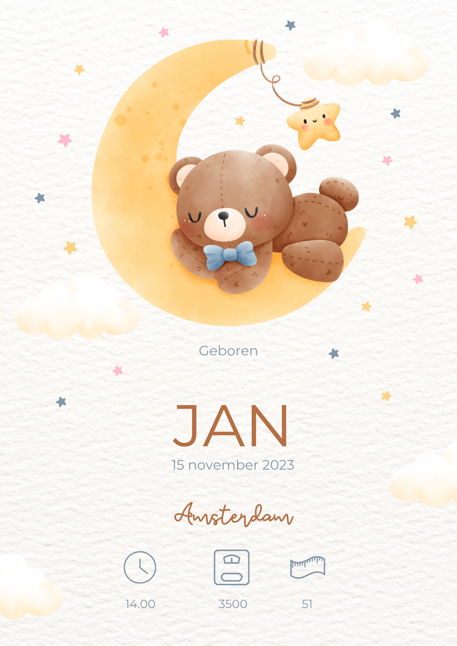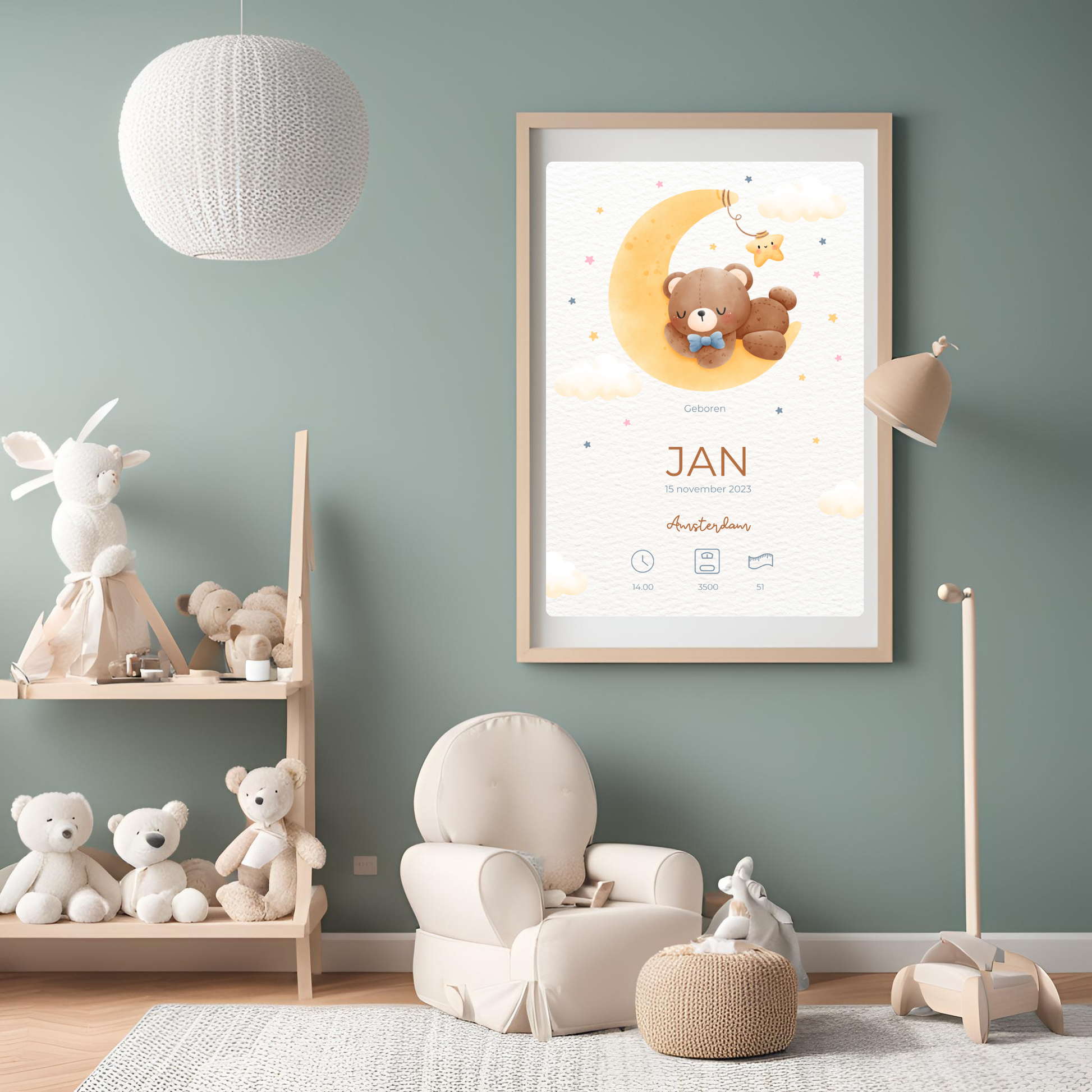 Maak de kamer van je kindje compleet met een prachtige, gepersonaliseerde geboorteposter. Deze poster is niet alleen een stijlvol decoratief stuk, maar ook een blijvende herinnering aan de speciale dag dat je kleintje geboren werd. Onze geboorteposters zijn ontworpen met liefde en aandacht voor detail, en kunnen volledig worden aangepast om perfect bij je wensen te passen.